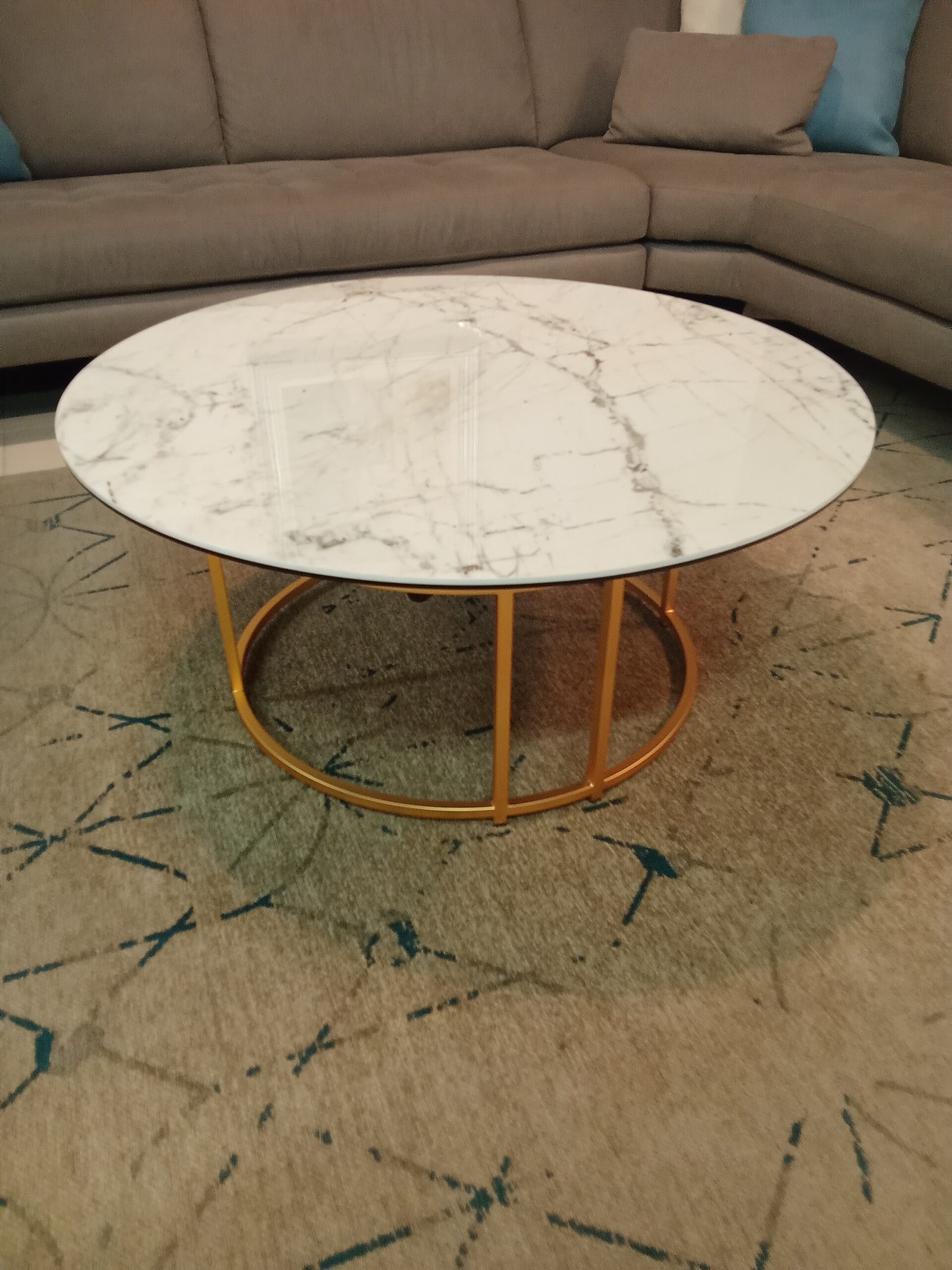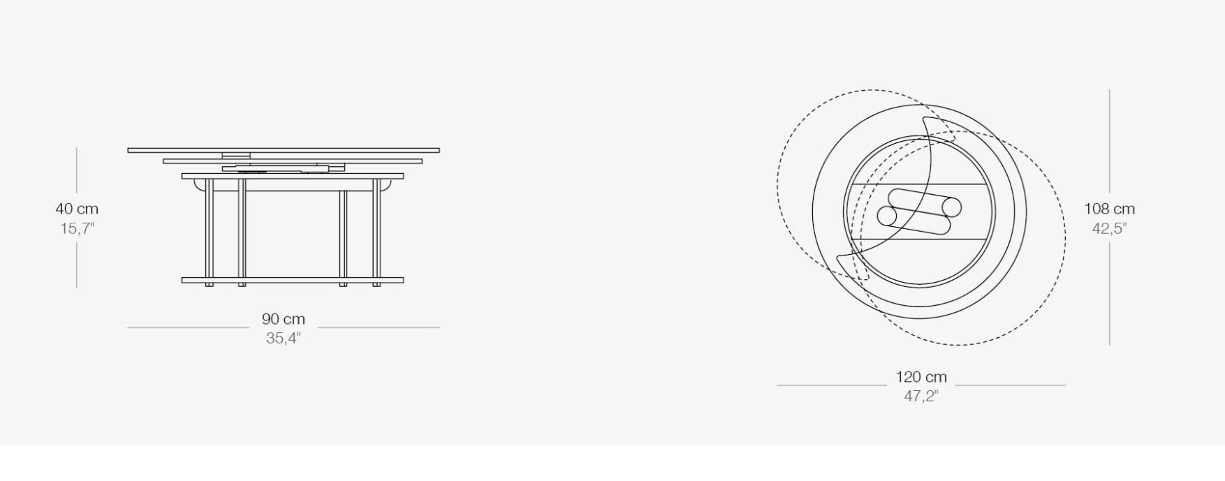Rozkladací konferenčný stolík s synchronizovanými otočnými doskami. Podnož je z lakovanej ocele v rôznych farbách. Horná a spodná doska môže byť z keramiky.