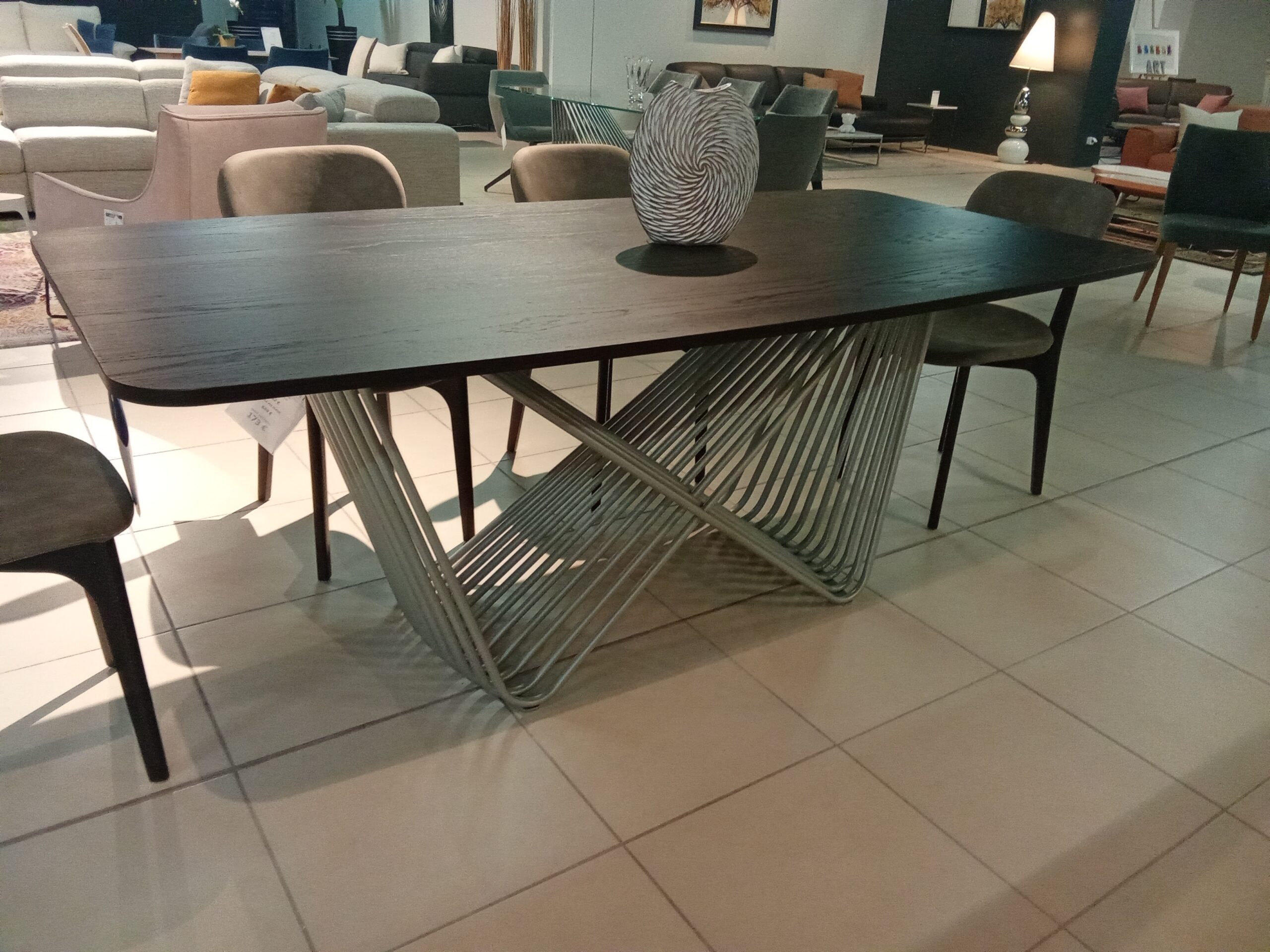 Jedálenská stôl s drevenou doskou a kovovou dizajnovou podnožou.